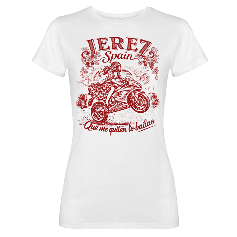 Women’s T-shirt featuring a fun front design reading “We Can Do It, 100% Biker,” with a biker-inspired style. Red, short-sleeved, and slightly fitted.