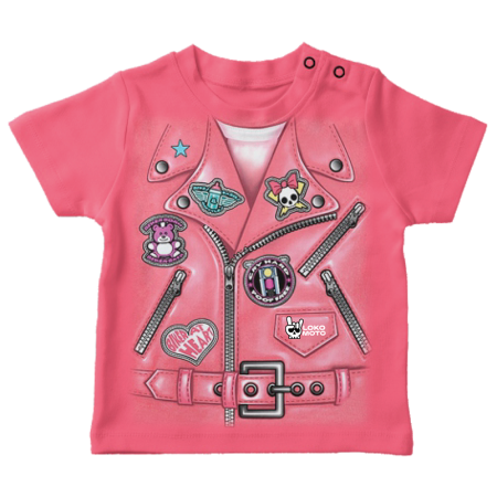 Boys' or girls' biker jacket design t-shirt. Short-sleeved t-shirt with a design on the front. Available in pink and black.
