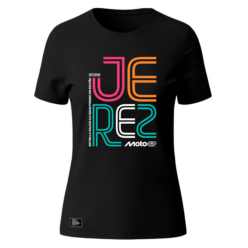 Camiseta de mujer del Gran Premio de Jerez , España, (ESTRELLA GALICIA 0,0 GRAND PRIX OF SPAIN), Circuito de Jerez Angel Nieto. Diseño en la parte delantera. Ligeramente entallada.